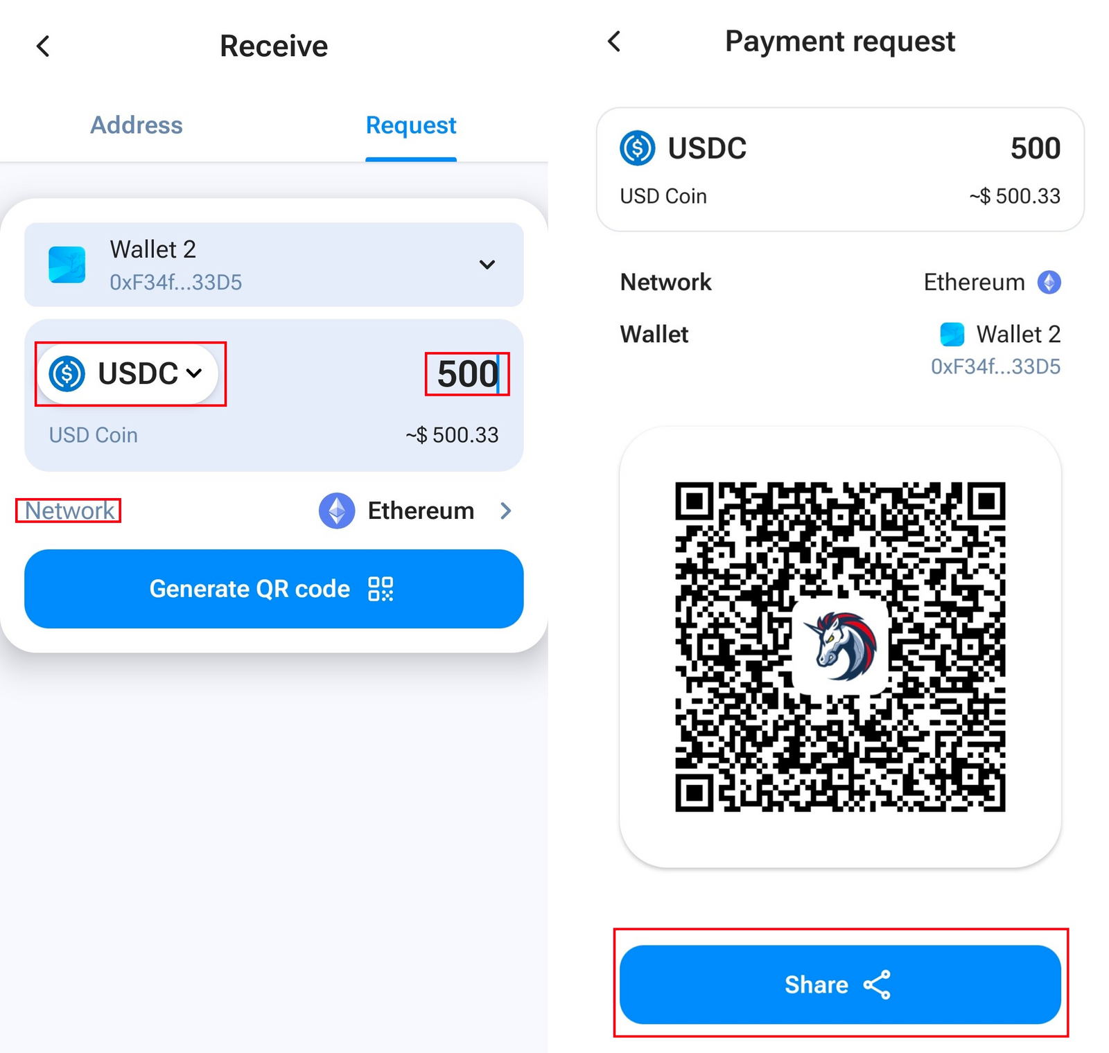 - 选择所需的网络和代币,并输入要接收的指定金额。